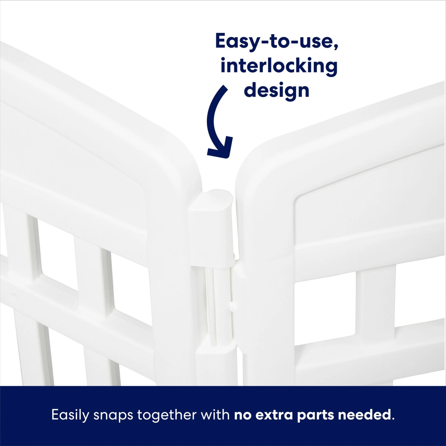 Playtime or downtime is always fun with the Frisco Plastic Dog Exercise Playpen with Door! It keeps your pooch enclosed safely in 18 square feet of comfortable space, indoors or outside. With individual panels featuring an interlocking design that easily snaps together and a secure, double-latch door requiring no extra assembly, it’ll be ready for use in no time. You can also adjust the shape of this paw-some pen to hold your best pal’s food and water bowls, toys and even a comfy bed. To protect your floors from scratches and scuffs, the panels offer non-skid rubber feet to help keep it in place.