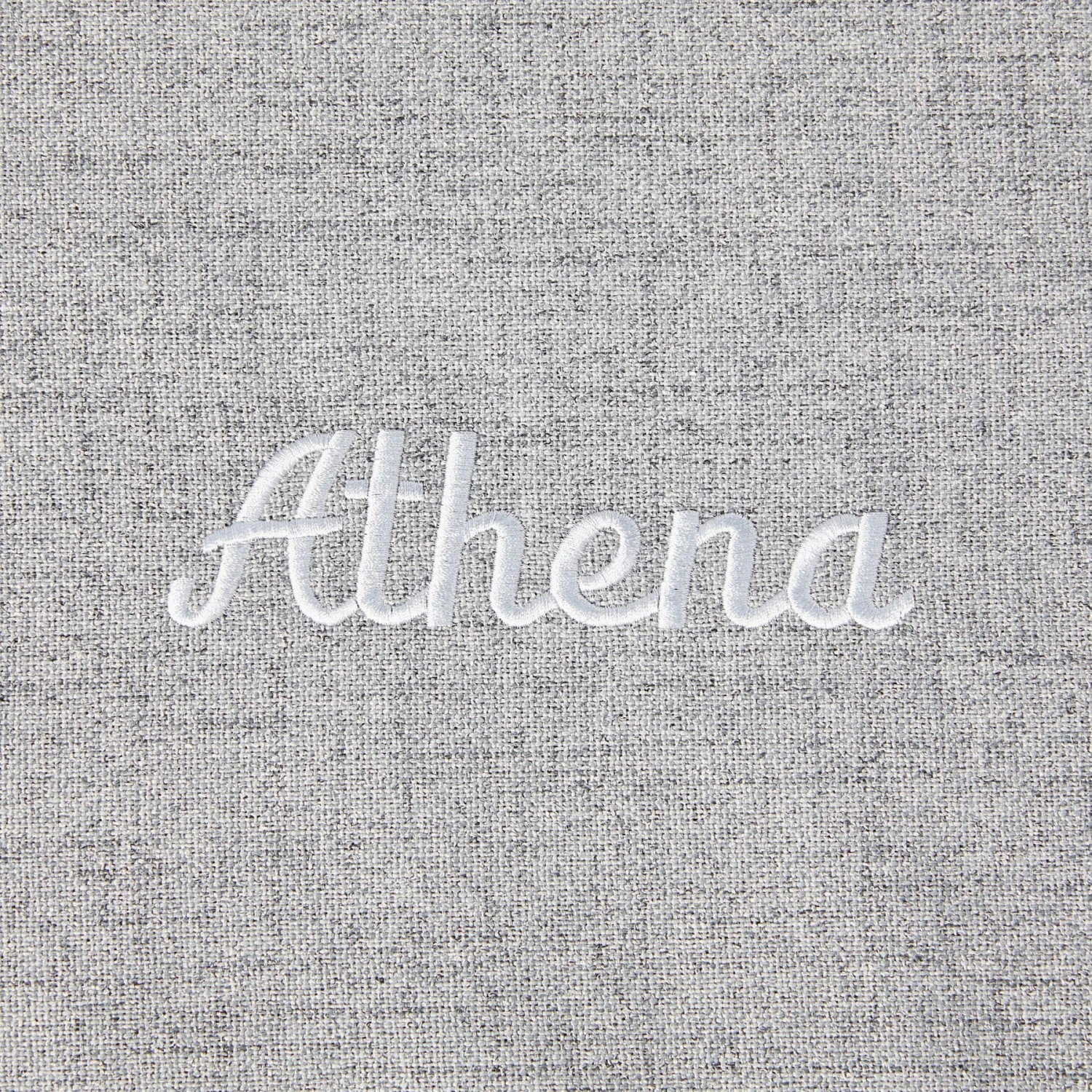 - Customizable with your choice of light gray or navy thread and flair script or block cap fonts.