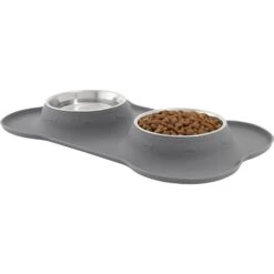 Frisco Double Stainless Steel Pet Bowl with Silicone Mat, Large, Gray, 1.75 Cups — Tip your hat to the virtually untippable Frisco’s Double Stainless Steel Pet Bowl with Silicone Mat. Designed to help prevent tipping over, these two removable stainless-steel bowls fit firmly into secure slots inside the silicone mat, which helps prevent spills too.