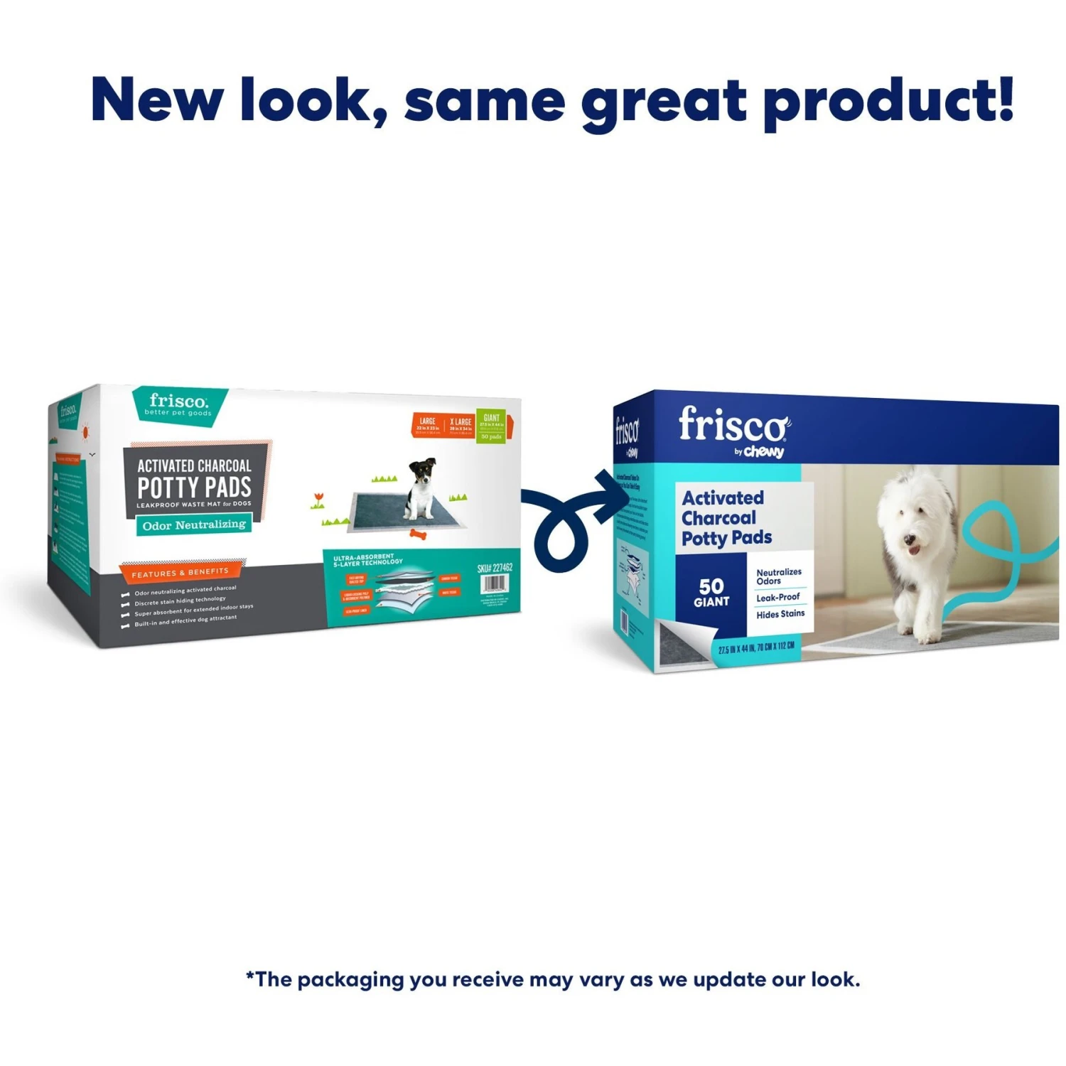Bring a patch of relief home for your pup with potty pads from Frisco by Chewy. A layer of activated carbon charcoal helps neutralize odors and hides stains, so your pup’s potty time is discrete. Five super absorbent layers and a built-in dog attractant make potty training a whole lot easier by encouraging pups to do their business in the same spot. The fast-drying quilted top layer prevents messy tracking, and the leak-proof liner helps keep your floors dry. They’re also perfect for extended indoor stays, protecting crates and carriers during transport, or for accommodating senior dogs with mobility issues. When it’s time for a new pad, simply drop it in the trash and replace with a fresh one—it’s that simple!