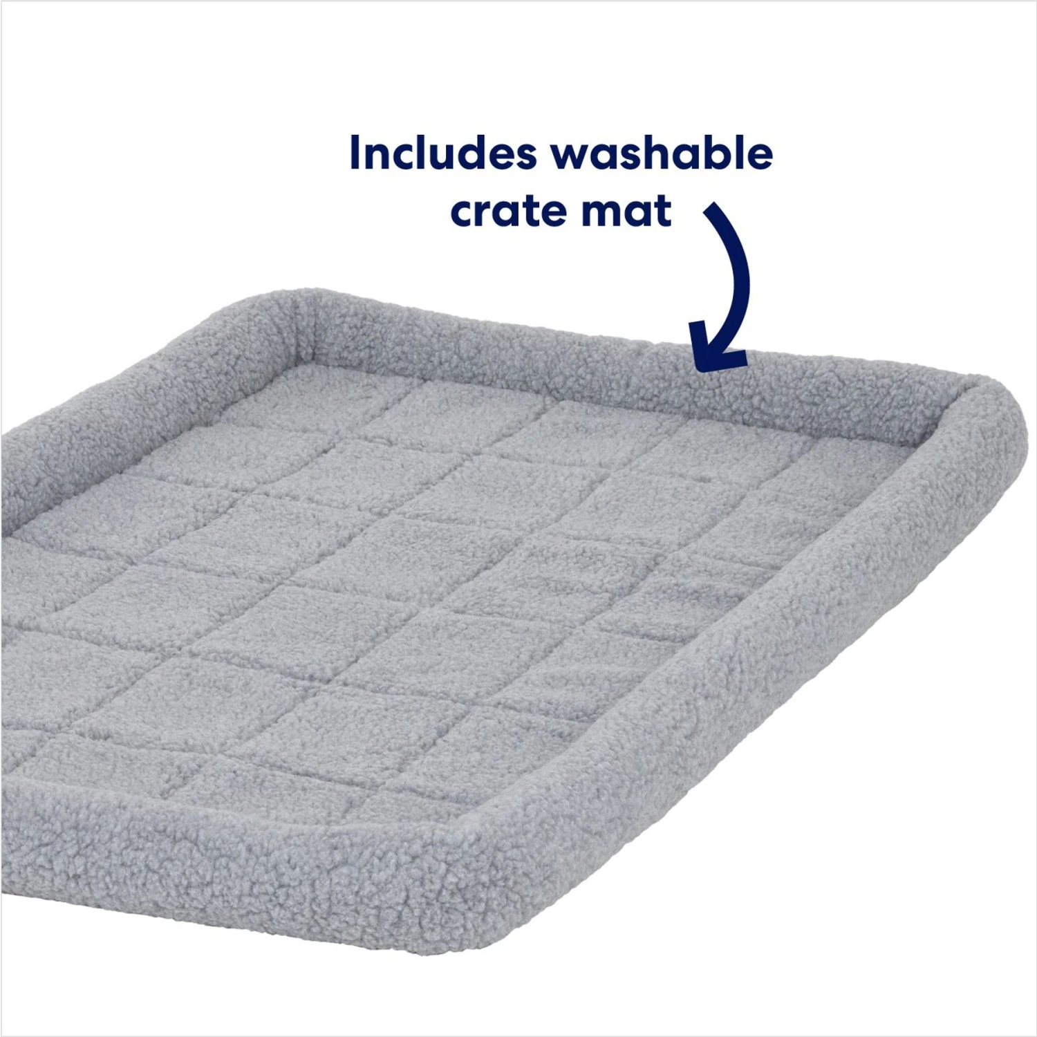 Give your pup a worthy, comfy castle with this heavy-duty double-door dog crate and mat kit, from Frisco by Chewy. Complete with a comfortable mat, it’s a lounge zone for your pup while they stay safely contained. The heavy-duty crate has thick wiring for added security, rounded corners for safety, and two large doors for easy in and out. A protective, black electro-coat finish means it’s made to last, and a secure lock with dual latches adds peace of mind. An included divider panel allows you to create a smaller space for growing pups, and the base pan makes cleanup easy. Assembly is simple—no tools required! It even folds flat with adjustable handles, allowing you to bring it wherever your pup goes.