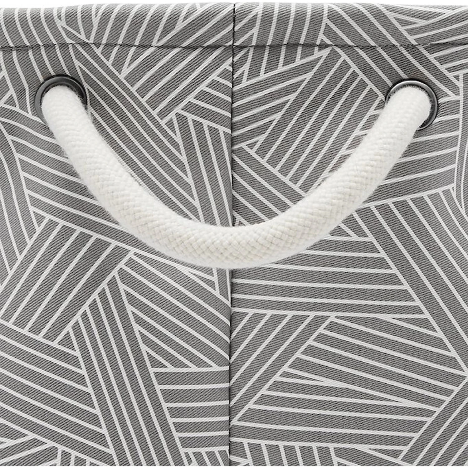 - Round, collapsible bin covered with neutral gray basket weave polyester fabric.
