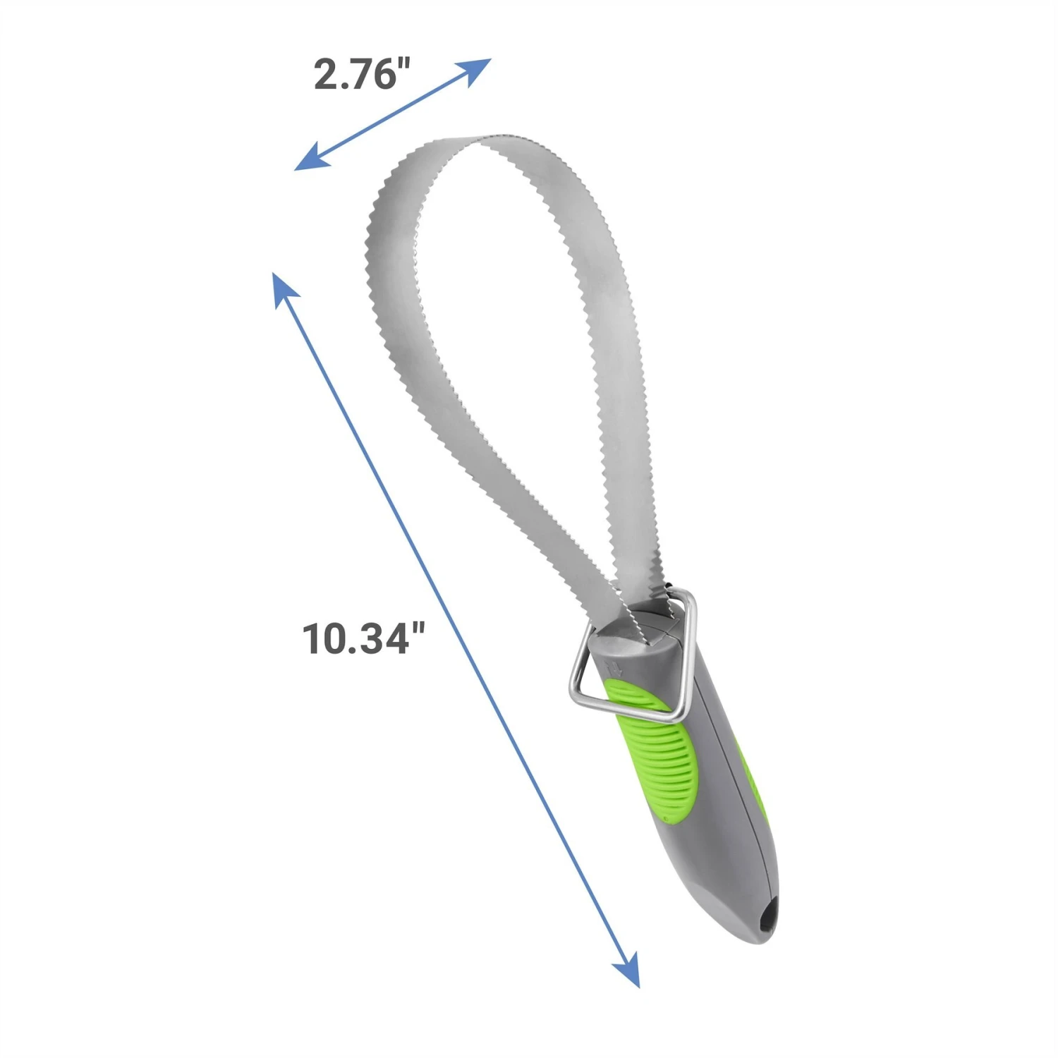 Blade can be used in loop position or unhooked flat position. Push up handle on side where rubber circle is higher. Pull hinged handle through the bar and apply the flat rake. Use light-medium pressure like you would on your own skin. Smaller serrated side is for wet fur or short, fine hair. Larger, wider serrated side is for medium/long dry fur to remove loose hairs.
