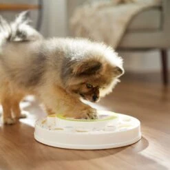 Do not allow your dog to chew or pick up the puzzle. Supervise your pet when using toy as small parts can present a choking hazard or cause internal blockage. Clean and store when not in use. Discontinue use if the toy is damaged or if parts become dislodged. No toy is indestructible. For indoor use only. For adult pet use only, not intended for puppies. Keep out of reach of children.